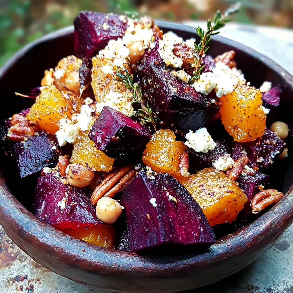 Betterave Rôtie à l’Orange, Feta, Noix de Pécan et Pois Chiches Croquants au Curry