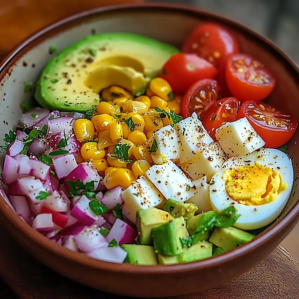 Ce bol énergétique œuf-avocat est un repas simple, sain et rapide à préparer. Il combine des œufs durs riches en protéines, un avocat crémeux, des tomates cerises juteuses, du maïs doux, et du fromage blanc, le tout relevé par une touche de guacamole et des herbes fraîches. Parfait pour un déjeuner équilibré ou un brunch vitaminé, ce bol allie fraîcheur et saveurs naturelles.