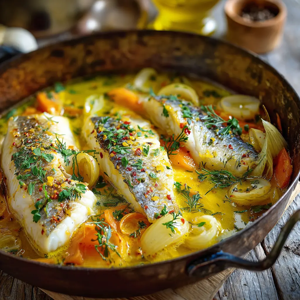 Plongez les filets de poisson blanc dans le bouillon parfumé. Faites-les pocher doucement pendant environ 10 minutes, jusqu’à ce que leur chair devienne tendre et nacrée. Retirez-les avec précaution, filtrez le bouillon pour enlever les herbes et légumes, puis reversez le liquide clair dans la casserole.