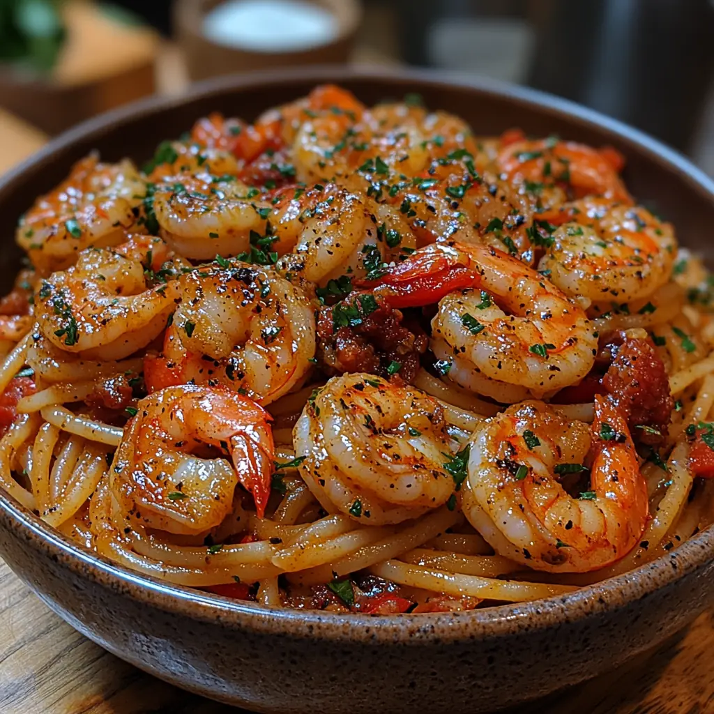 Spaghetti à la Crème de Poivron, Chorizo & Crevettes
