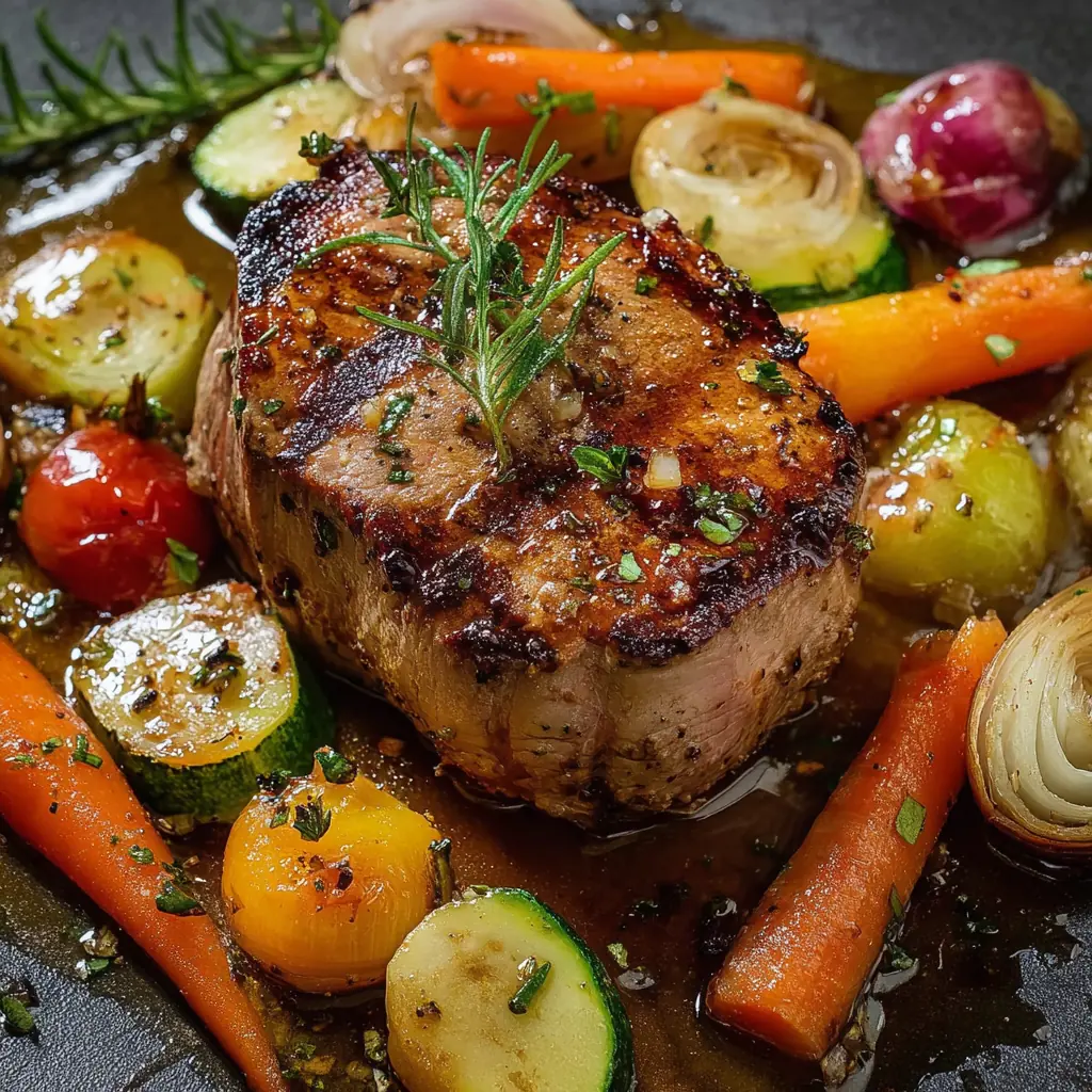 Absolument. Le principe de cette recette fonctionne aussi très bien avec un filet mignon de veau ou même de dinde pour une version plus légère. Les temps de cuisson peuvent légèrement varier selon la viande choisie, mais la marinade reste la même. Vous pouvez également adapter les garnitures en fonction de la viande, par exemple en ajoutant davantage de pommes avec la dinde ou plus de légumes racines avec le veau.