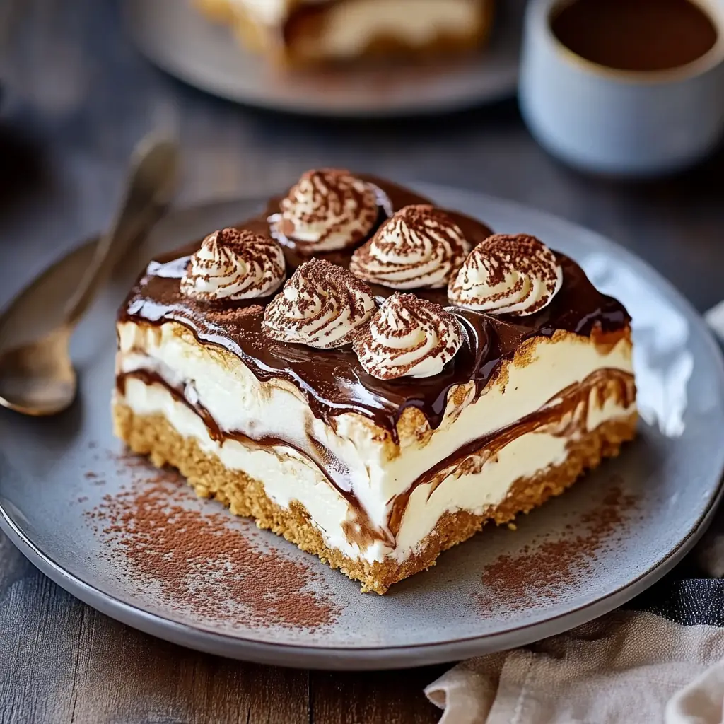 Étalez le glaçage uniformément sur la dernière couche de biscuits. Couvrez ensuite le plat d’un film alimentaire et placez-le au réfrigérateur pendant au moins 4 heures, idéalement toute une nuit. Durant ce temps, les biscuits s’imprègnent de la crème et deviennent tendres, créant une texture fondante irrésistible.
