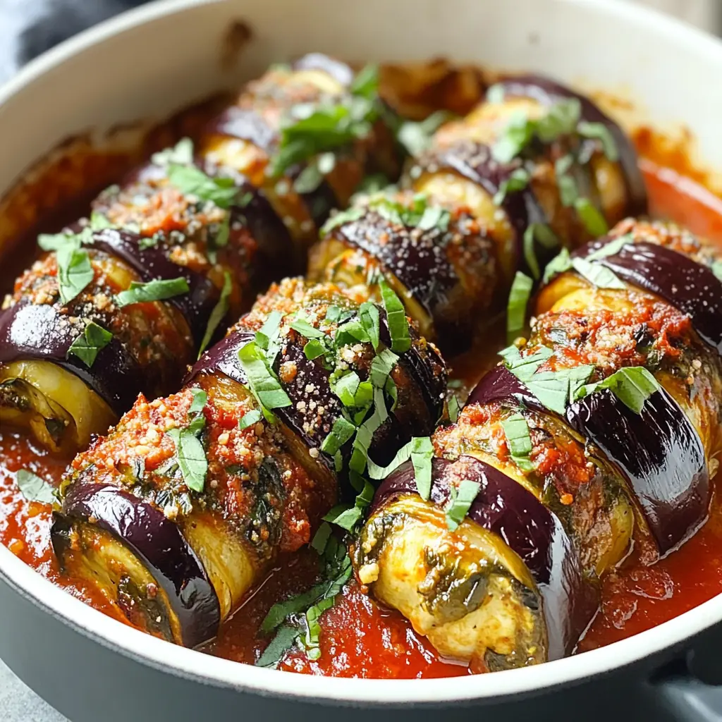 Les aubergines, tendres et dorées, enveloppent une garniture riche et crémeuse à base de ricotta et de parmesan. Chaque bouchée est un équilibre subtil de textures et de goûts : la douceur de la ricotta, la légère amertume de l’aubergine grillée et la vivacité du citron s’unissent à merveille. Et lorsque ces rouleaux sont nappés d’une sauce tomate maison parfumée au basilic, le résultat devient absolument irrésistible.