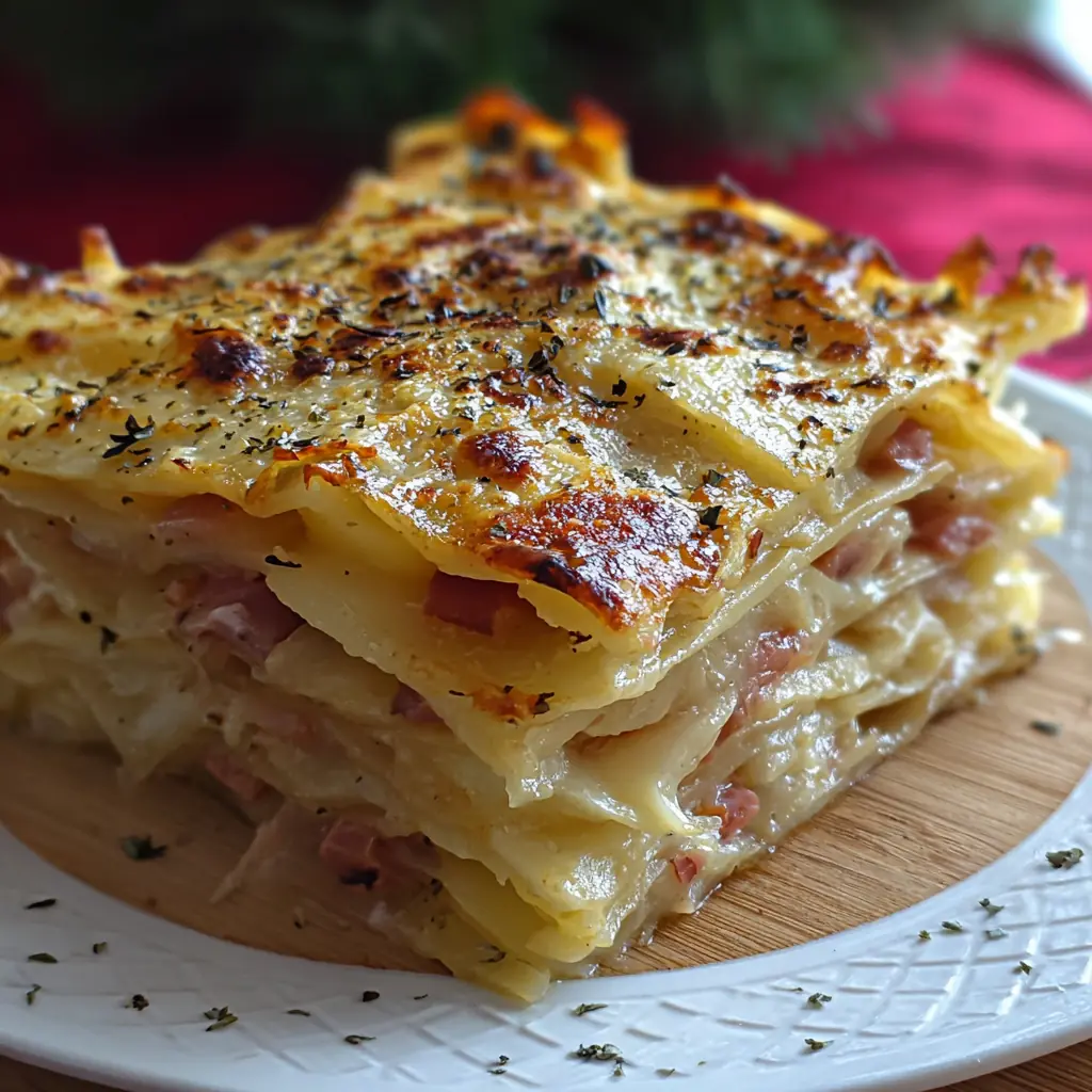 Ces lasagnes de pommes de terre gourmandes sont une alternative originale aux lasagnes classiques. Des tranches fondantes de pommes de terre remplacent les pâtes et s’associent au jambon de poulet fumé, à une sauce crémeuse et au beaufort gratiné. Le résultat est un plat familial réconfortant, parfait pour régaler petits et grands lors d’un repas convivial.