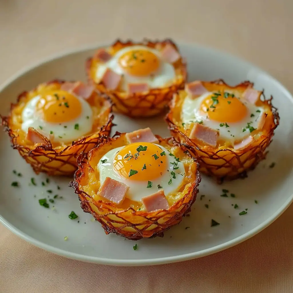 Ces nids de pommes de terre, œufs, jambon de poulet et fromage sont un plat délicieux et simple à préparer. Ils combinent la douceur des pommes de terre croustillantes avec la richesse des œufs, la saveur tendre du jambon de poulet et le fondant du fromage râpé. Parfaits pour un petit déjeuner gourmand, un brunch ou même un dîner léger, ils impressionneront vos invités par leur présentation originale et leur goût réconfortant.