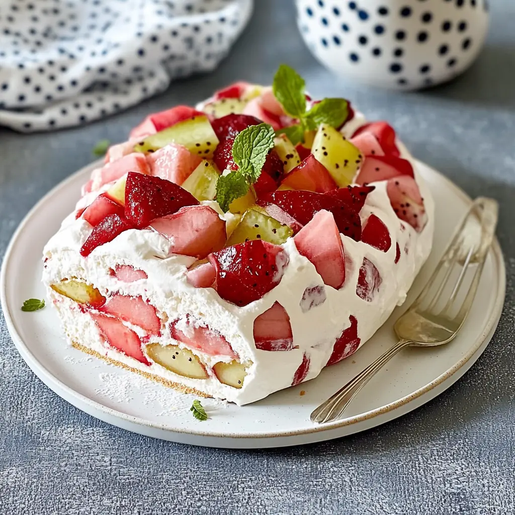 Je me souviens encore de la première fois où j’ai préparé cette Pavlova roulée à la rhubarbe et au mascarpone. C’était un après-midi d’été, la rhubarbe fraîchement cueillie embaumait la cuisine, et je voulais créer un dessert à la fois aérien, fruité et raffiné. J’aime la pavlova pour sa légèreté — cette meringue croustillante à l’extérieur, fondante à l’intérieur — et ici, elle devient encore plus élégante en version roulée, avec la crème au mascarpone et la rhubarbe rôtie qui lui apportent une touche acidulée irrésistible.