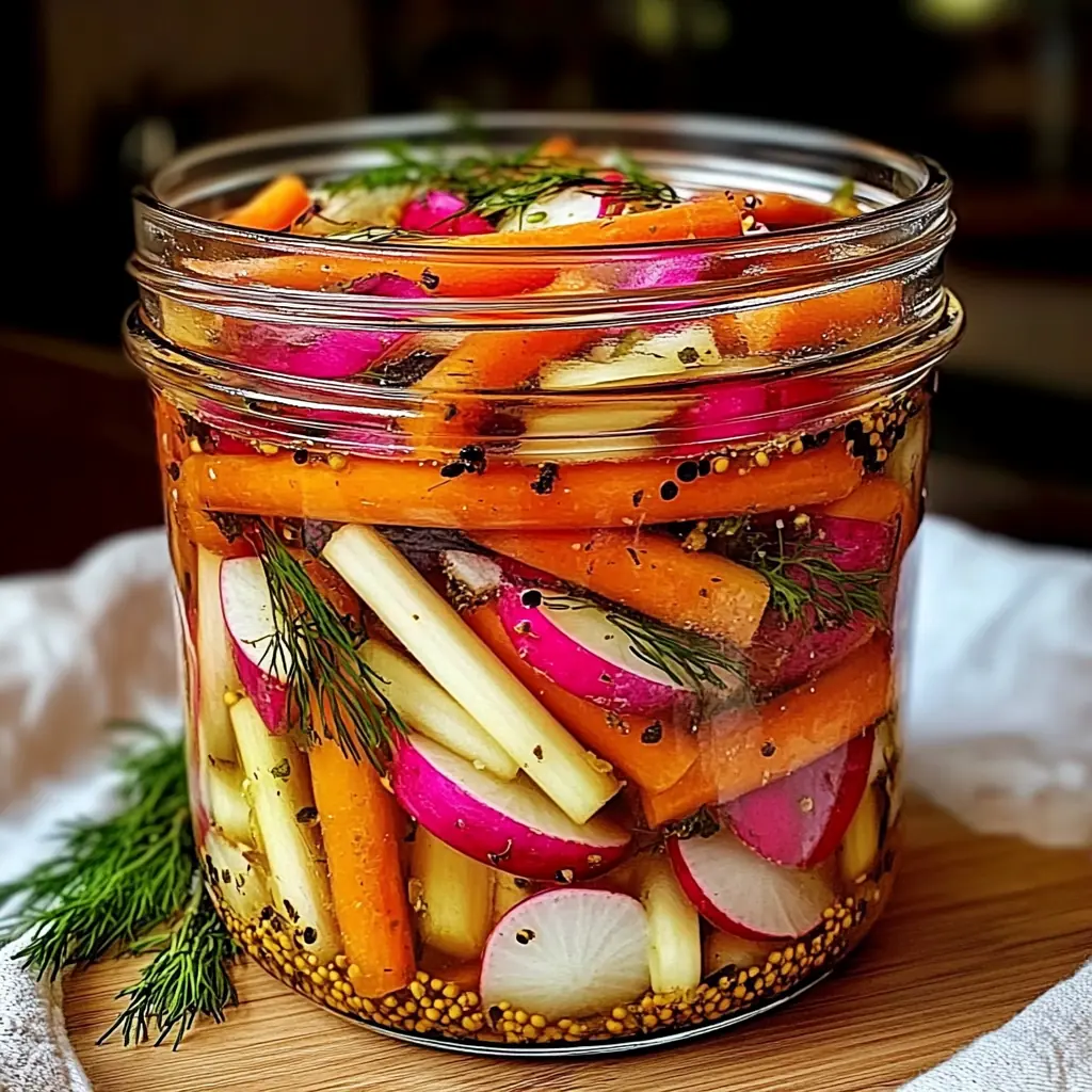 Ces pickles de carottes, radis et herbes aromatiques offrent une explosion de saveurs croquantes et fraîches. Le mélange du vinaigre de cidre, du sucre, des épices et des herbes fraîches crée un condiment parfait pour accompagner vos plats ou pour un apéritif sain et savoureux.