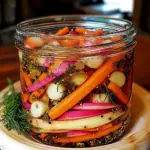 J’ai toujours aimé préparer des pickles maison. C’est simple, rapide et tellement gratifiant. Dès que je vois des carottes bien fraîches au marché et une belle botte de radis croquants, je n’y résiste pas. Cette recette est née un jour de printemps, lorsque j’avais envie de créer quelque chose de coloré, plein de goût et qui se conserve bien au réfrigérateur. En y ajoutant des herbes aromatiques comme la coriandre et l’aneth, j’ai découvert un équilibre parfait entre fraîcheur, croquant et acidité.