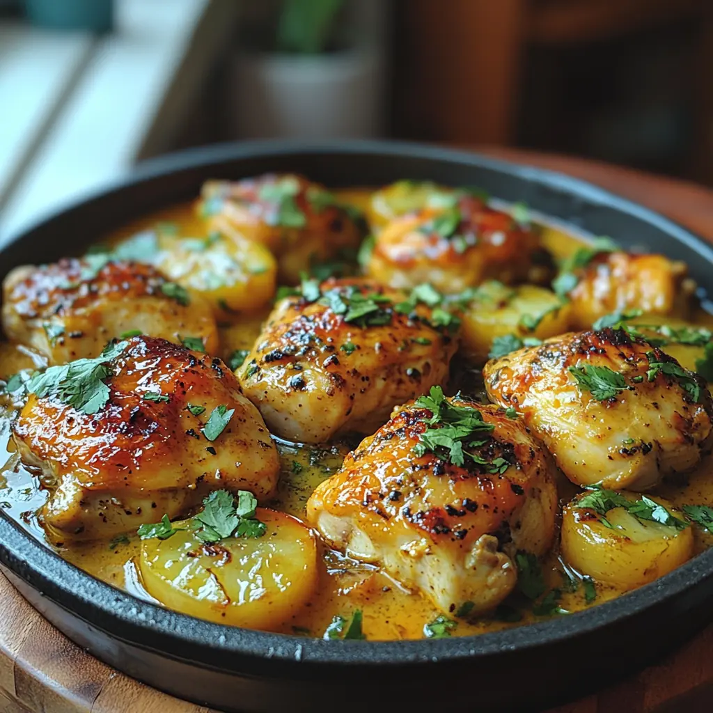 Je me souviens encore de la première fois où j’ai préparé ce poulet rôti au lait de coco et coriandre. J’étais à la recherche d’un plat simple, parfumé et réconfortant à la fois. Quelque chose qui embaume la cuisine sans demander des heures de préparation. Ce jour-là, en ouvrant mon placard, j’ai trouvé une boîte de lait de coco, quelques cuisses de poulet bien charnues dans le frigo, et un bouquet de coriandre fraîchement acheté au marché. Et voilà comment est née cette recette que je partage aujourd’hui avec vous.