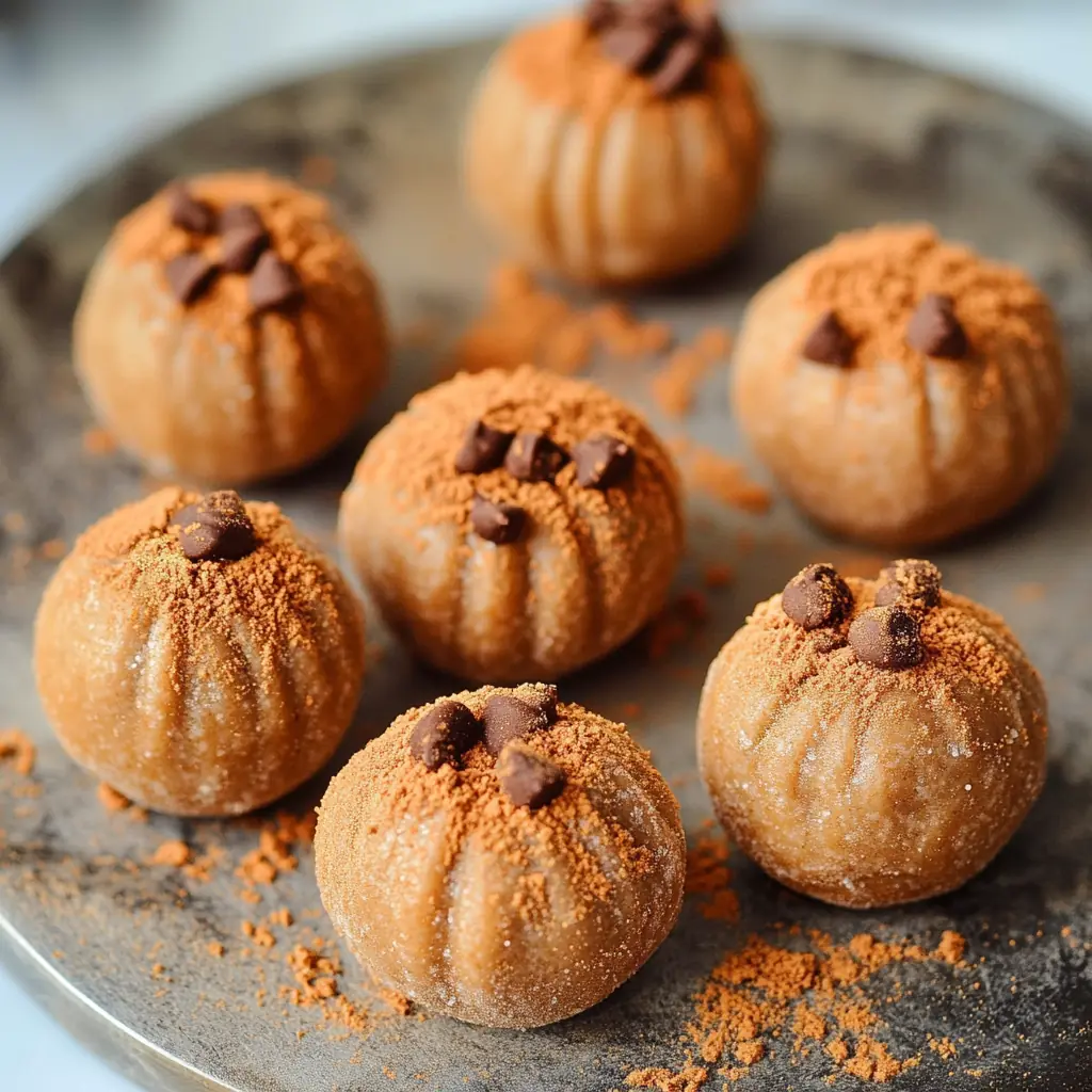 Décoration finale soignée : l’utilisation d’un cure-dent pour tracer des rainures est une étape simple mais efficace qui transforme de simples boules en mini-citrouilles charmantes. La petite pépite de chocolat posée sur le dessus finit le travail avec élégance.
