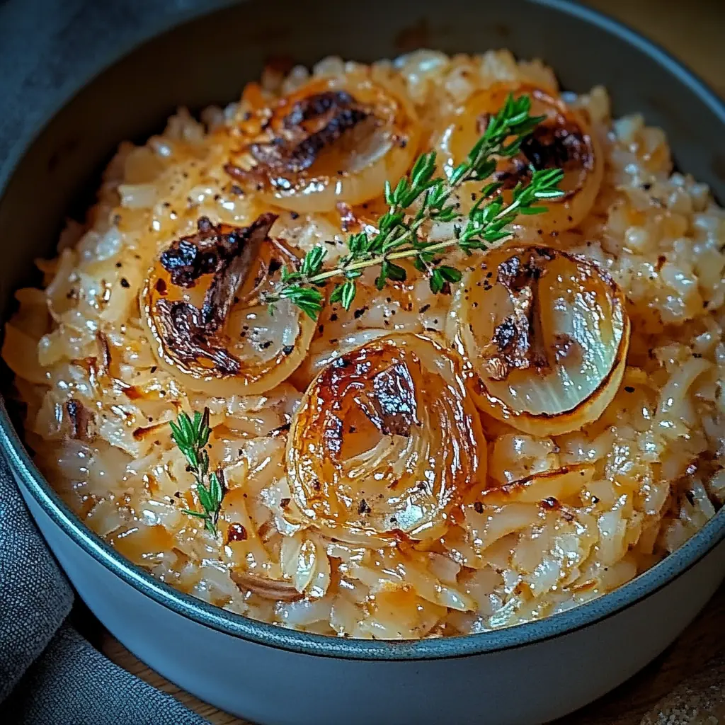 Ce riz se déguste aussi bien seul qu’en accompagnement d’un plat principal. Chaque bouchée révèle la douceur des oignons caramélisés, la richesse du bouillon et le fondant du fromage — une expérience gustative à la fois simple et raffinée.