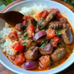 Ce plat ne demande pas de techniques compliquées, mais plutôt un peu de patience et d’amour pour laisser les saveurs se marier lentement. Pendant la cuisson, les oignons caramélisent légèrement, les épices libèrent leurs arômes, et les saucisses s’imprègnent d’une sauce riche et onctueuse. Servi bien chaud, accompagné de riz blanc ou de lentilles, le rougail devient un véritable voyage gustatif vers l’océan Indien.