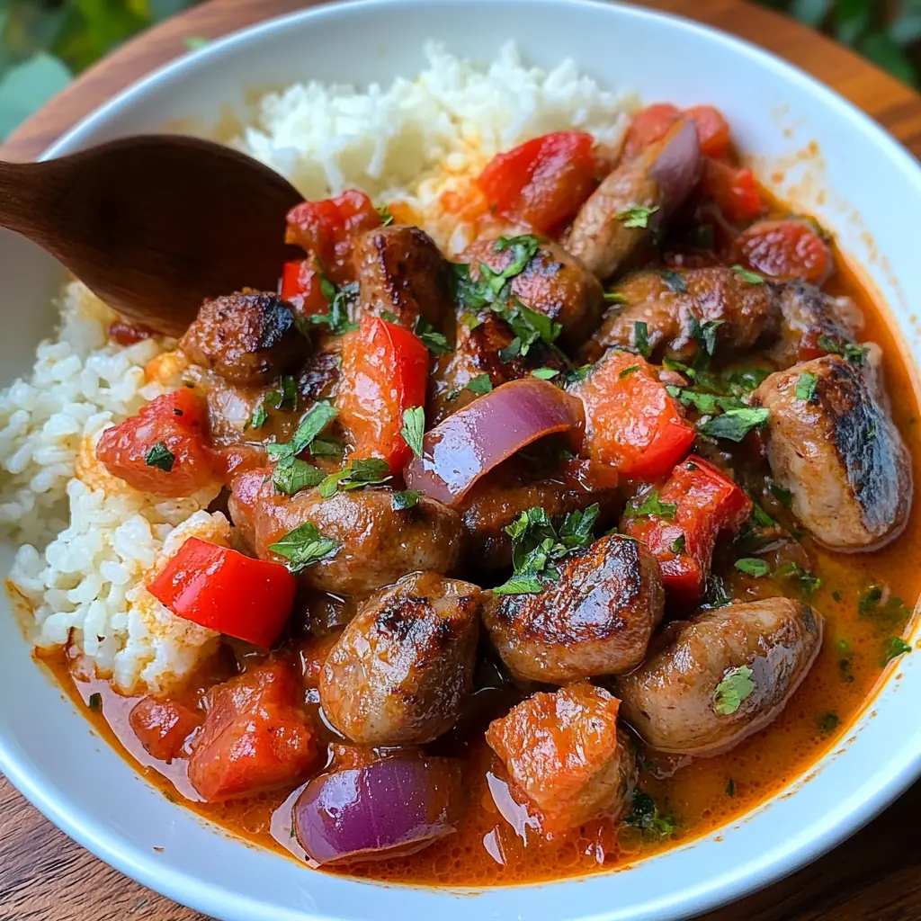 Vérifiez la consistance de la sauce : elle doit être épaisse, légèrement confite, et bien enrobée autour des saucisses. Goûtez et ajustez l’assaisonnement si nécessaire. Servez bien chaud avec du riz blanc, des lentilles ou même un rougail de tomates fraîches pour un contraste parfait.