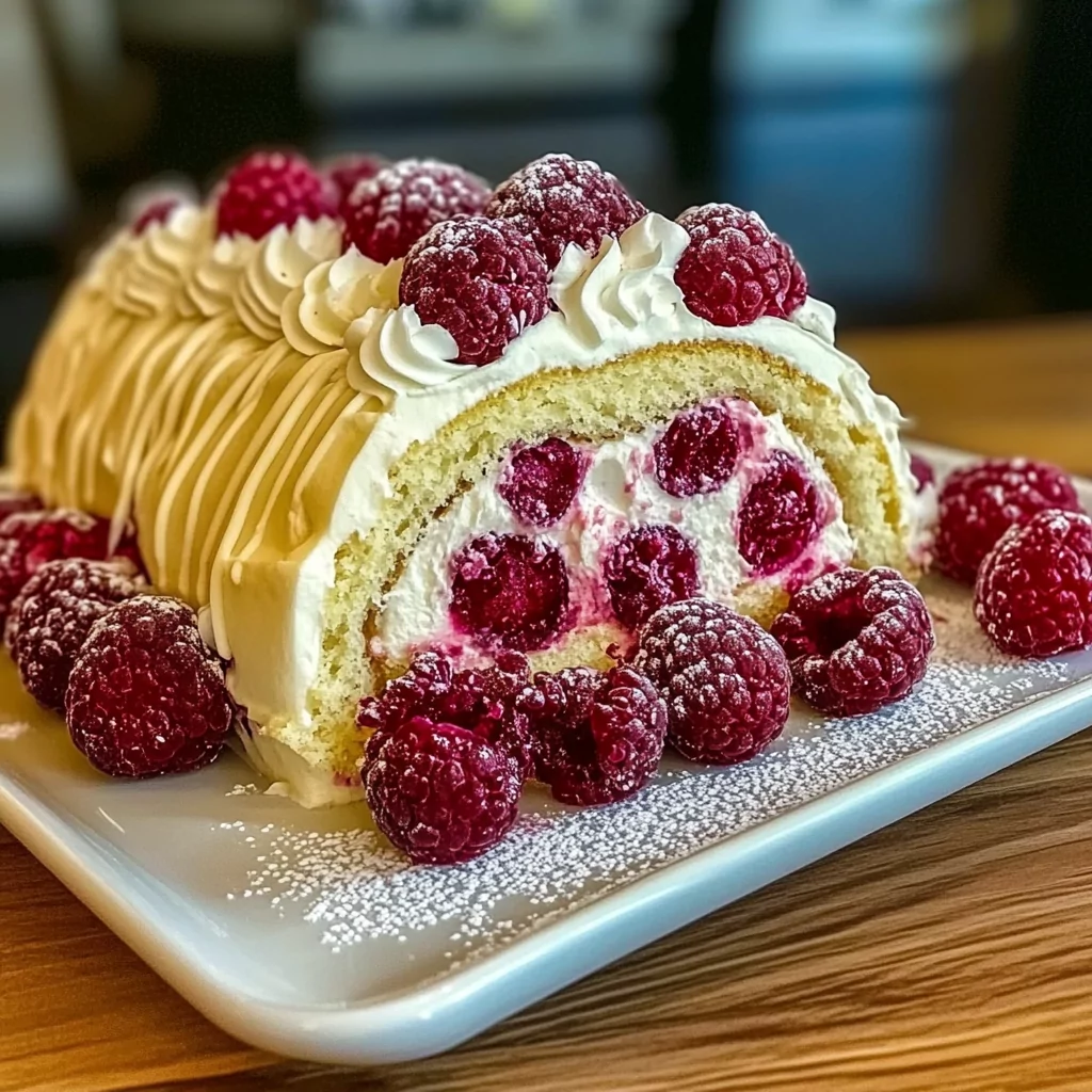 💡 Pour un roulé encore plus gourmand, ajoutez une fine couche de confiture de framboises ou un peu de crème fouettée avant d’y déposer les framboises.