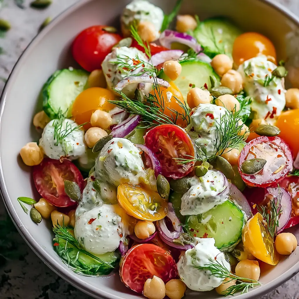Ces pois chiches, légumes frais et tzatziki crémeux forment une salade simple mais raffinée, parfaite pour toutes les occasions. Chaque bouchée combine fraîcheur, croquant et saveur méditerranéenne. Servez-la en plat principal, en accompagnement ou avec du pain pita pour un repas léger et savoureux.