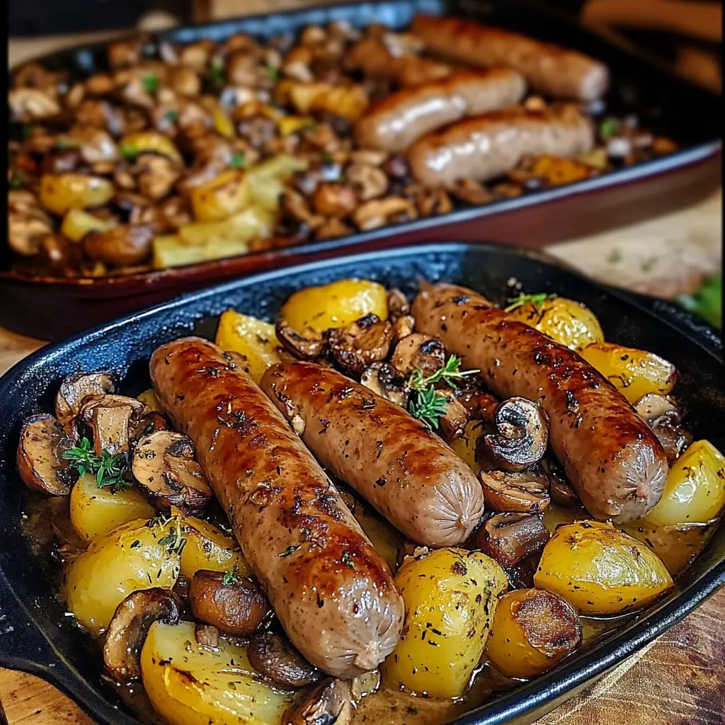 Ce que j’aime dans ce plat, c’est son côté rustique et réconfortant. Les pommes de terre deviennent tendres et dorées, les champignons libèrent leurs arômes boisés, et les saucisses se parent d’une belle couleur appétissante après leur passage au four. L’ajout des herbes de Provence transforme le tout en une explosion de parfums qui me rappelle les plats familiaux d’autrefois. Et le plus beau, c’est que tout cuit ensemble dans un seul plat, ce qui simplifie grandement la préparation et la vaisselle.