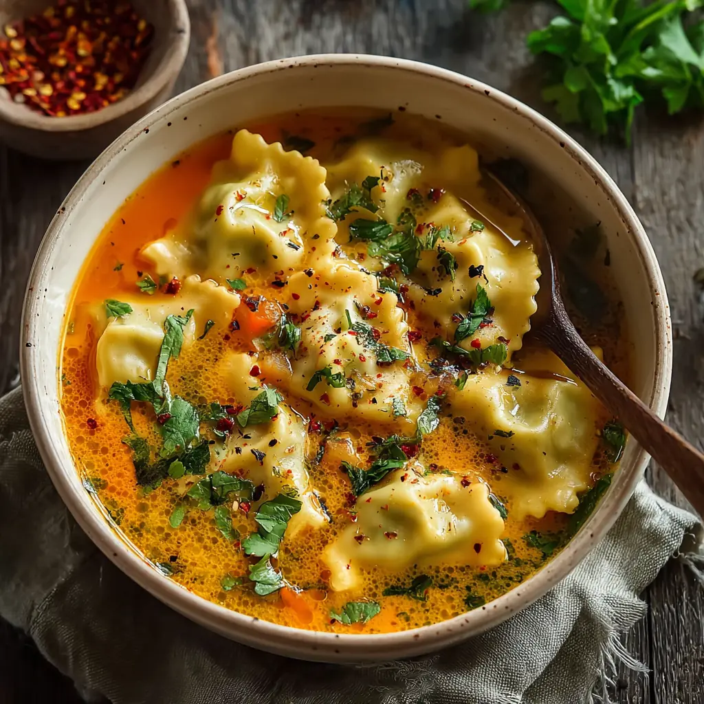 La base de cette soupe repose sur un bouillon parfumé au curry rouge et au lait de coco. Ce mélange crée une alliance riche et onctueuse, avec un équilibre harmonieux entre douceur et intensité. Les raviolis viennent ensuite apporter une touche originale et consistante qui transforme ce plat en un repas complet, capable de satisfaire toute la famille. Chaque bouchée offre à la fois le moelleux des pâtes farcies et la profondeur des épices thaïes.