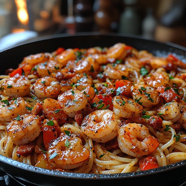 Ces spaghetti à la crème de poivron, chorizo et crevettes sont prêts à être dégustés, offrant un mélange parfait de textures et de saveurs. Bon appétit !