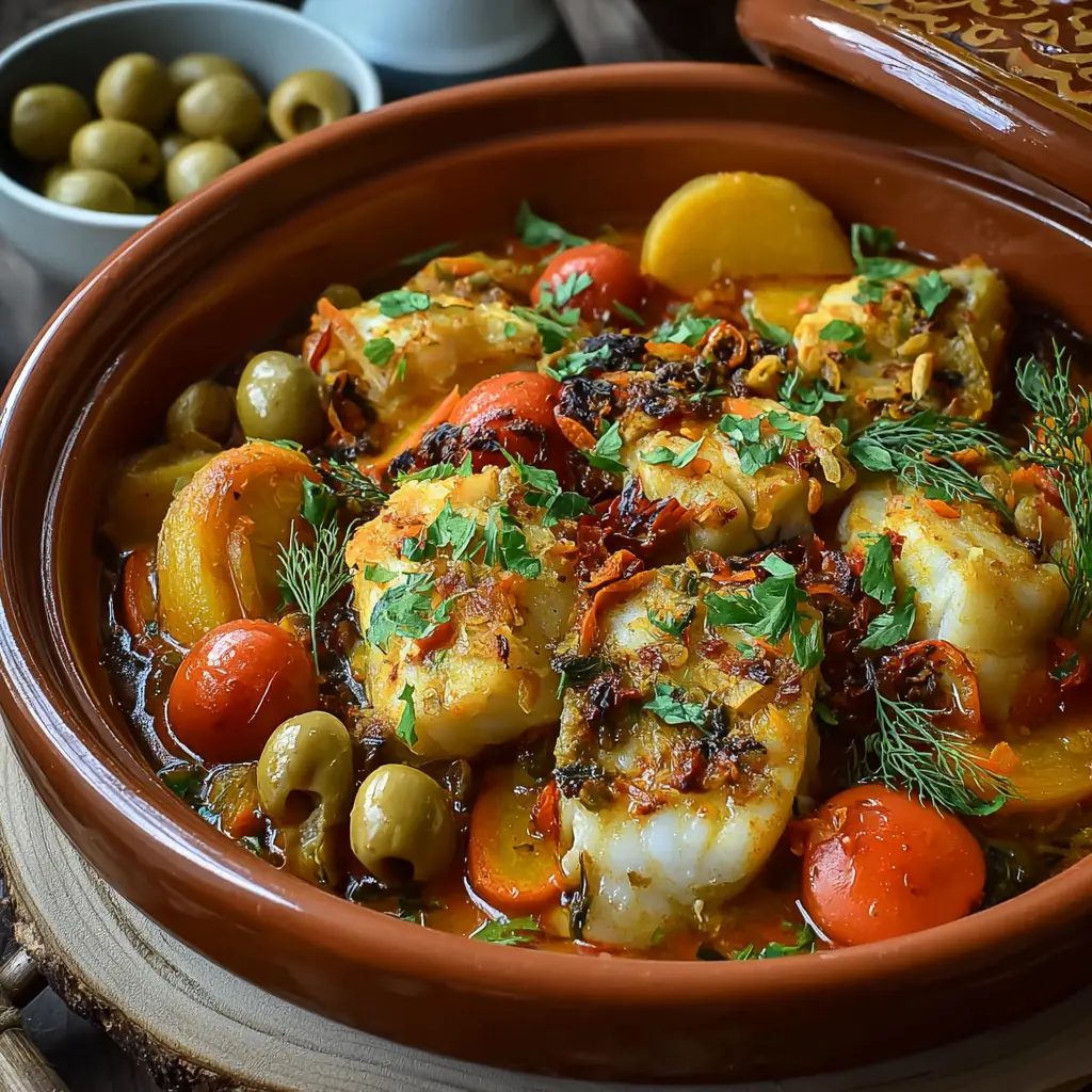 Ce que j’aime particulièrement dans ce plat, c’est la façon dont les saveurs se marient pendant la cuisson lente. Le safran apporte une teinte dorée et une profondeur aromatique unique, tandis que le lait de coco ou la crème légère ajoute une onctuosité irrésistible à la sauce. Les tomates et les oignons mijotés forment une base savoureuse qui enveloppe délicatement les médaillons de lotte. L’ajout d’olives vertes et de coriandre fraîche en fin de cuisson complète ce tableau parfumé avec une touche vive et légèrement acidulée.