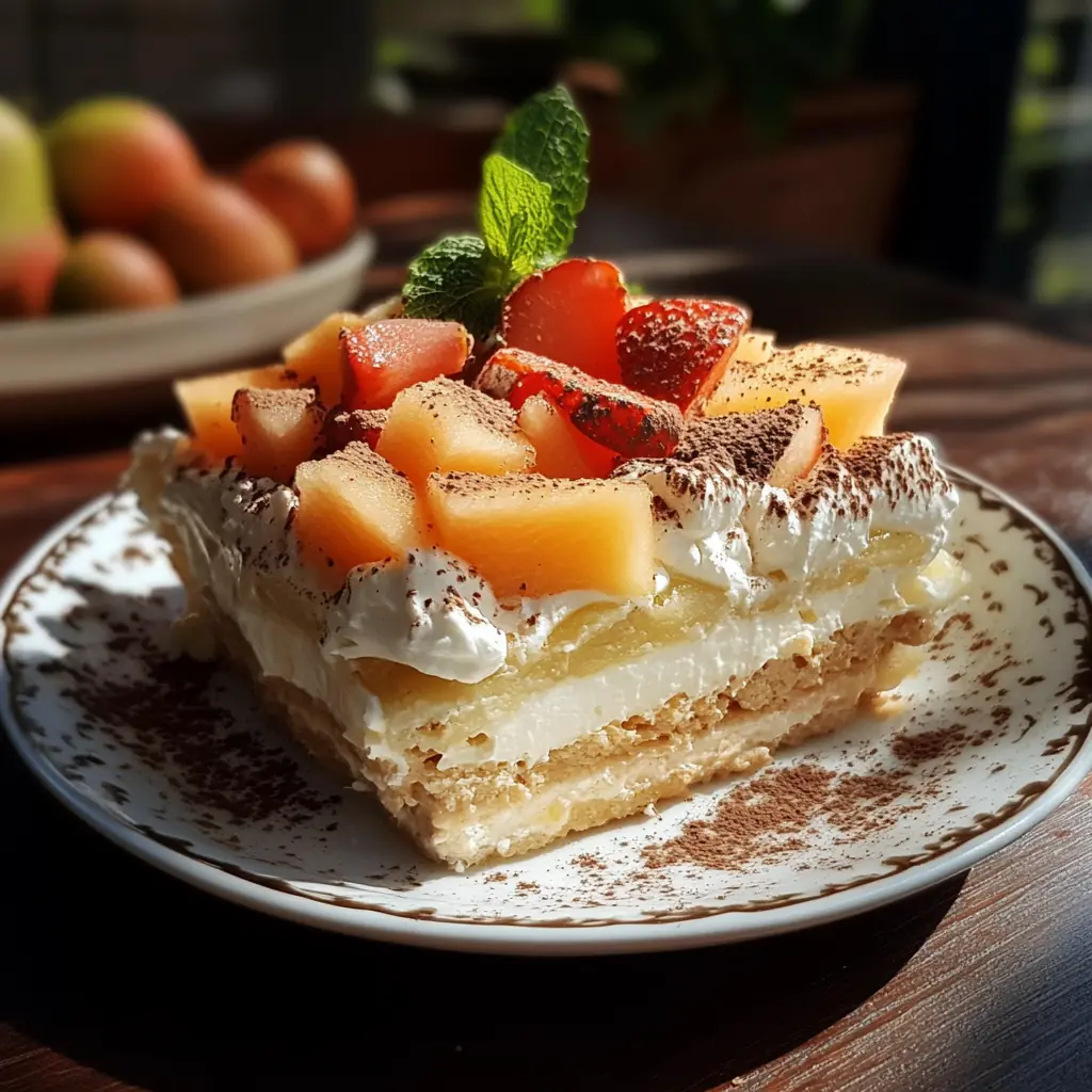 Ce plat est une véritable expérience gustative. Le melon juteux remplace les traditionnels biscuits à la cuillère. Il apporte une douceur naturelle et une texture tendre. À cela s’ajoute le jambon de poulet, finement tranché, qui offre une note salée parfaitement équilibrée. Et pour lier le tout, une crème légère au fromage frais, à la fois douce et aérienne. Chaque bouchée est une rencontre entre fraîcheur fruitée, saveur umami et onctuosité.