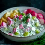 Chaque bouchée offre une explosion de saveurs : le piquant doux des radis, la fraîcheur des herbes, l’acidité du citron et le velouté du yaourt se marient harmonieusement. Que vous le serviez pour un apéritif léger, un déjeuner sain ou en accompagnement d’un plat méditerranéen, ce tzatziki apporte toujours une note rafraîchissante et colorée à la table.