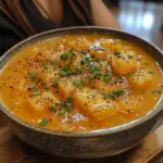 Ce velouté est aussi très polyvalent : on peut le servir nature, avec juste un peu de crème fraîche et une touche de ciboulette pour la couleur et la fraîcheur, ou le personnaliser avec des garnitures comme des graines grillées ou des croûtons maison. Chaque cuillerée offre une texture veloutée et un équilibre parfait entre douceur et épices, qui font de ce potage un incontournable pour les saisons froides.